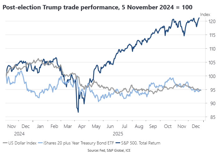 The pre- and post-election ‘Trump trade’ came unstuck with April’s Liberation Day tariff shock, prompting a generalised run on US dollar asset markets, but US equities would go on to make new highs into year-end: