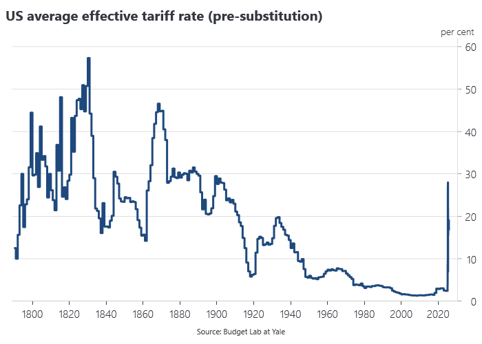 The US effective tariff rate rose to the highest level in over 100 years, one of the biggest peacetime tax increases in US history: