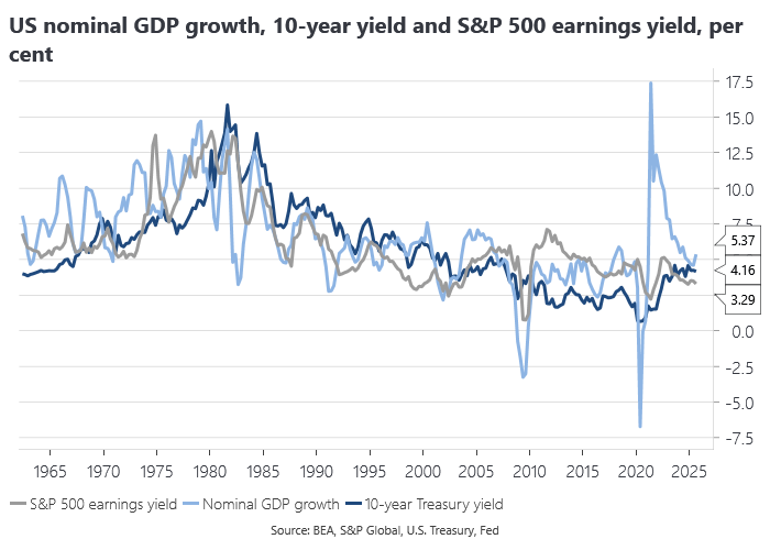 The US 10-year Treasury yield became cheap relative to equities, although 10-year yields remained rich relative to nominal GDP growth, which accelerated in the third quarter, leaving a more positive NGDP gap based on Mike Sandifer’s model:
