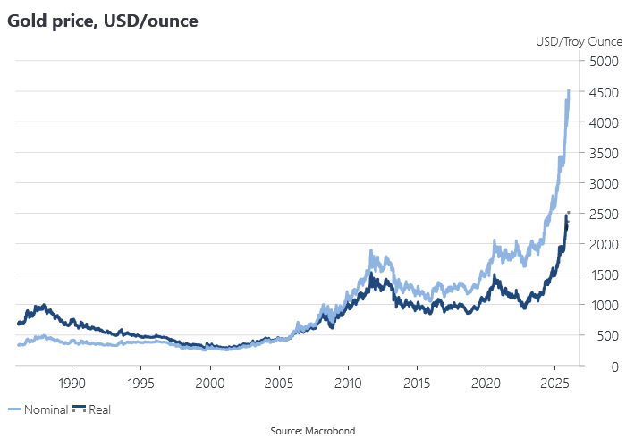 The gold price made record highs in nominal and real terms. Analysts explained the run-up in terms of the usual laundry list of gold positive factors, but these explanations were hard to square with developments in the economy or other asset markets: