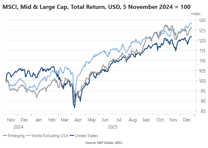 US stocks underperformed their global peers, in what was perhaps the biggest surprise of 2025, although consistent with the idea that tariffs and the associated policy uncertainty were first and foremost a problem for the US rather than the rest of the world:
