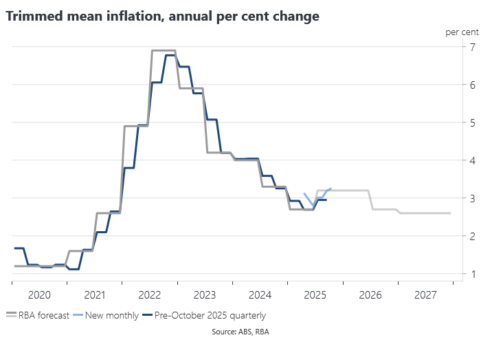 Before the release of the Q3 CPI, RBA Governor Bullock set the benchmark for the release by characterising a possible 0.9% q/q print for the trimmed mean as a ‘material miss’ relative to the RBA’s then forecasts. In the event, we got 1%. But neither the headline nor trimmed mean prints for October are significantly out of line with the RBA’s forecasts, which always had inflation rising before falling again in mid-2026.